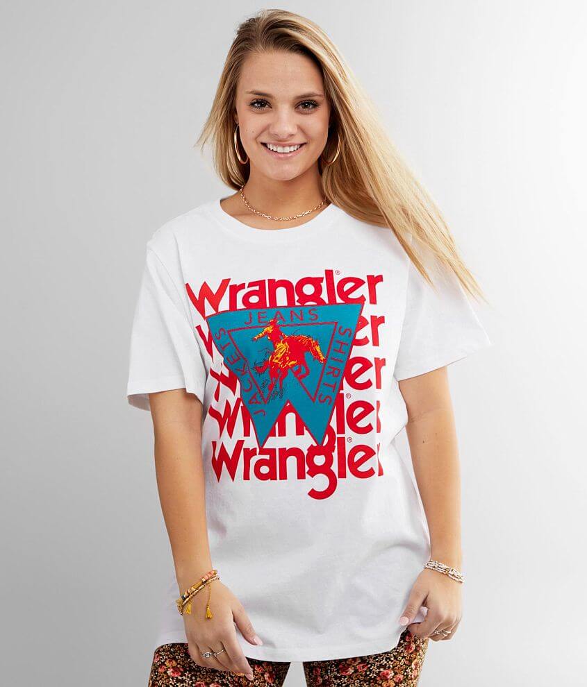 NOTHING BUT WRANGLERGOOD VIBES Introduce a little bit of retro cool into your t-shirt rotation with our womens Wrangler relaxed ringer tee. Home SHIRTS Womens Wrangler T-Shirt. Wrangler is the top destination for pearl snap western shirts americana tees southwestern-inspired sweaters and so much more.